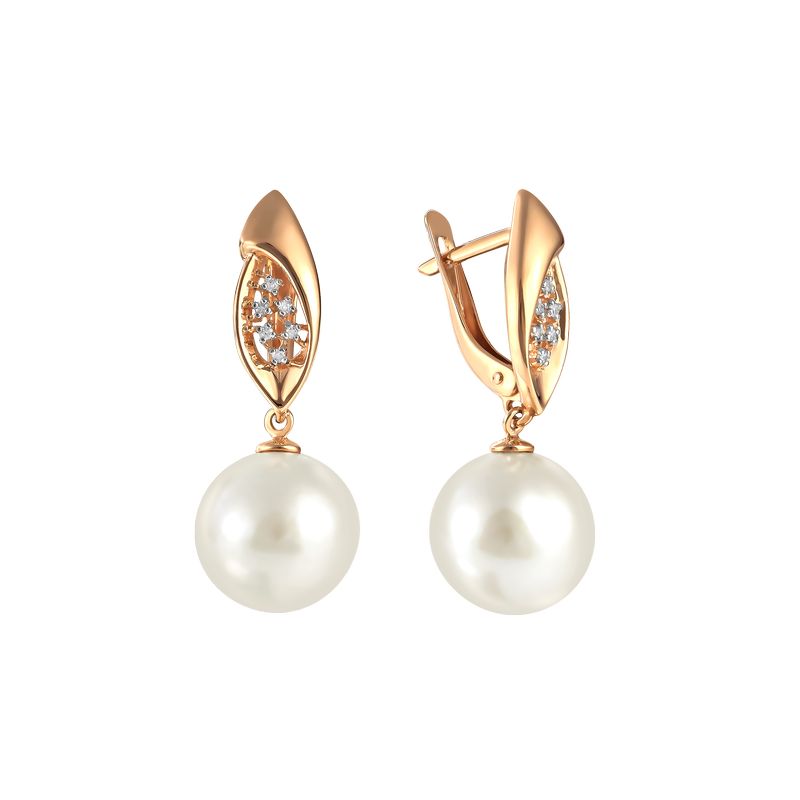 Серьги из красного золота 585° пробы с жемчугом и фианитом