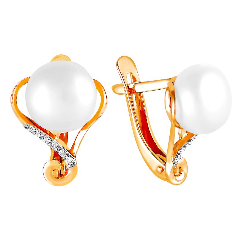 Серьги из красного золота 585° пробы с жемчугом и фианитом