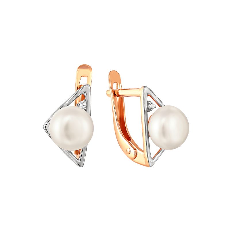Серьги из красного золота 585° пробы с жемчугом и фианитом