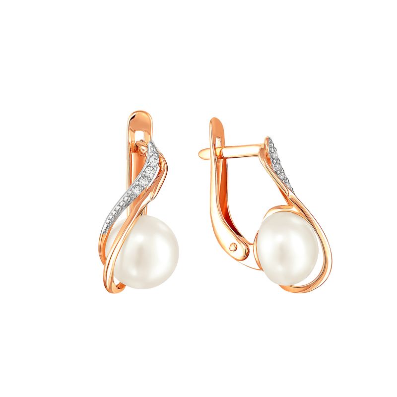 Серьги из красного золота 585° пробы с жемчугом и фианитом