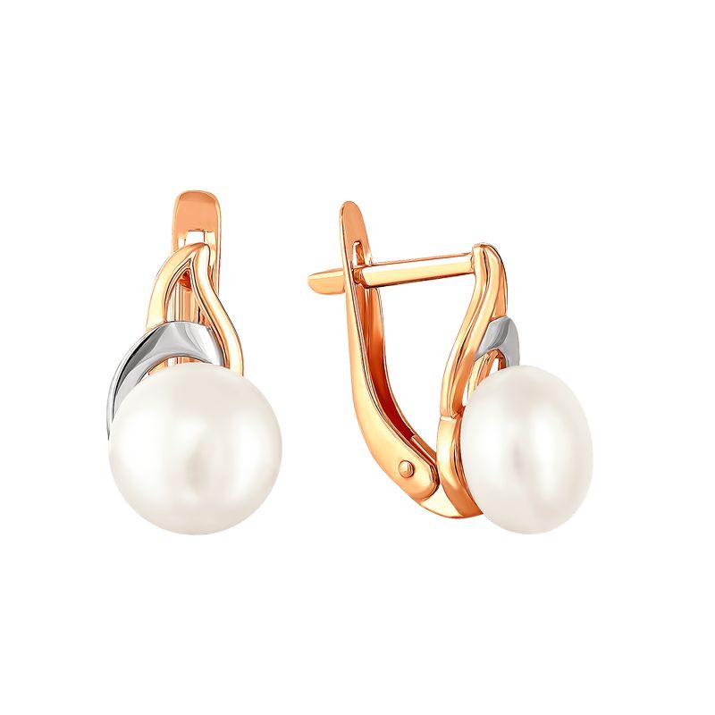 Серьги из красного золота 585° пробы с жемчугом и фианитом