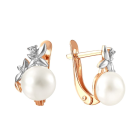 Серьги из красного золота 585° пробы с жемчугом и фианитом