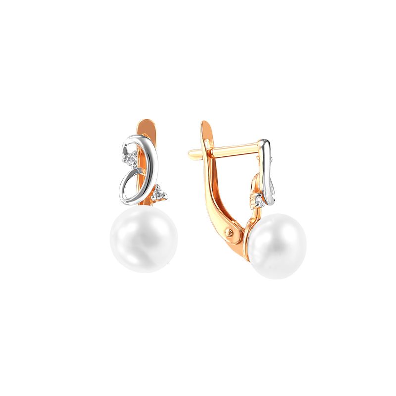 Серьги из красного золота 585° пробы с жемчугом и фианитом