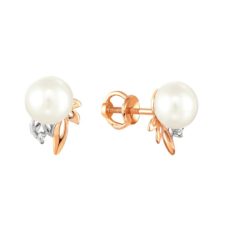 Серьги из красного золота 585° пробы с жемчугом и фианитом